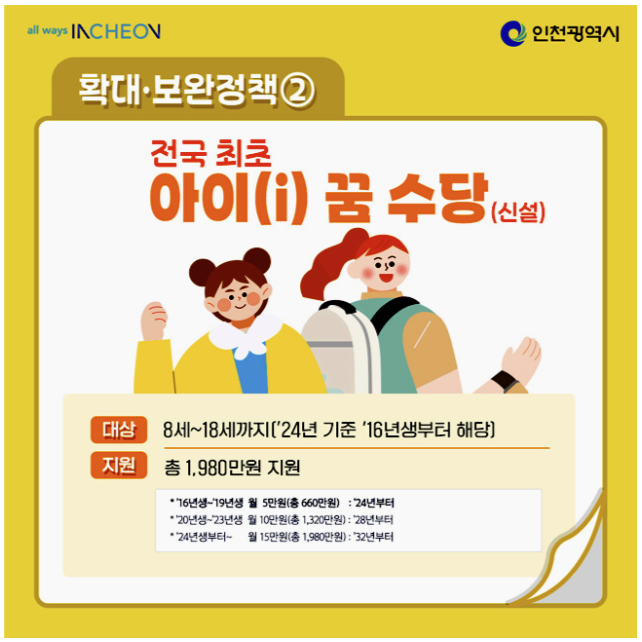 ‘아이(i) 꿈 수당’은 인천시가 전국 최초로 도입한 학령기(8세~18세) 아동 대상 지원금입니다. 예체능 활동비, 학원비, 진로체험비 등 아이의 미래 설계를 위한 자율적인 비용으로 사용할 수 있도록 설계되어 있어요.