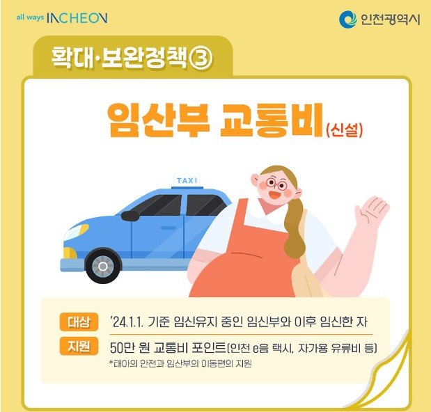 - 임산부 교통비 지원: 임신 중 1회 50만 원 교통카드 지급