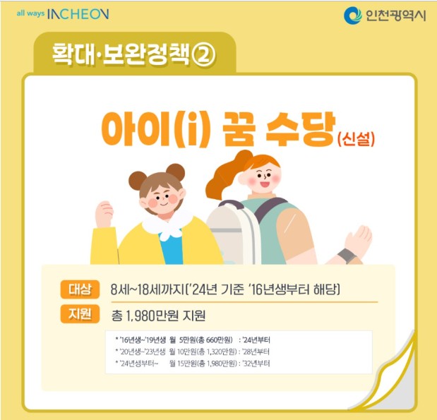 인천시는 아동과 임산부를 위한 별도의 장기적 지원 프로그램을 운영 중입니다. 특히 '천사(1040) 지원금'과 '아이꿈수당'은 나이대에 따라 꾸준히 지급되기 때문에 장기적인 혜택으로 중요합니다.