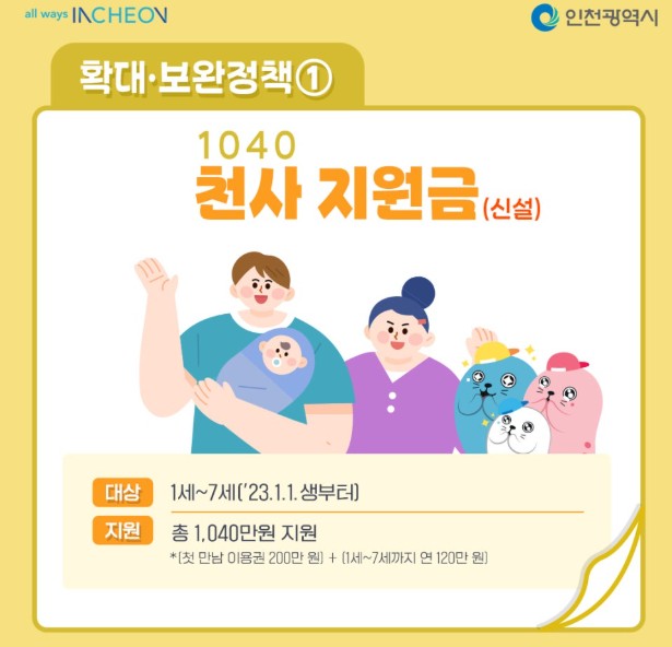 - 천사(1040) 지원금: 1~7세 아동에게 연 120만 원씩 지급 (최대 840만 원)