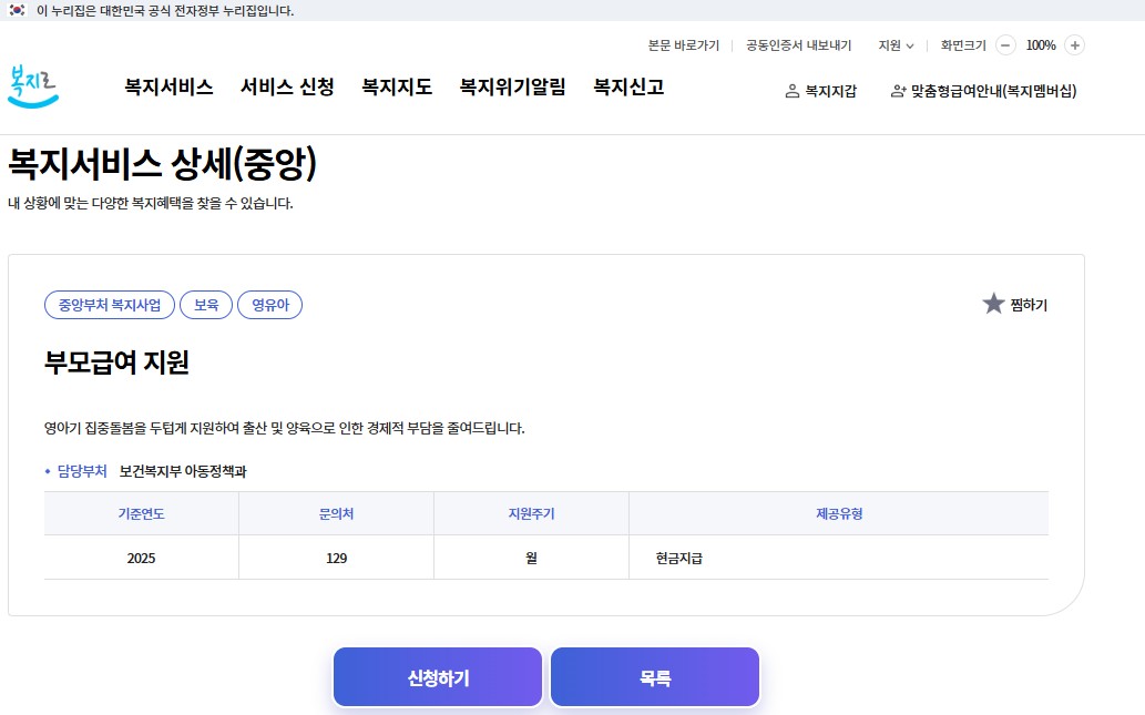 | 부모급여 | 만 0세: 월 100만 원 / 만 1세: 월 50만 원 |